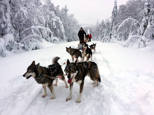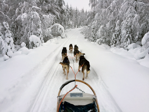 Al snel snappen we wat Susi met ’te warm voor de honden’ bedoelt. De sneeuw is plakkerig, waardoor de zes husky’s af en toe moeite hebben de slee de heuvels op te trekken. Het maakt de band met de dieren alleen maar sterker. Als zevende ‘lid’ van de roedel helpen we regelmatig de slee voort te duwen. Aan de goedkeurende blikken van de honden te zien kunnen ze de hulp waarderen. Terwijl zij ons onverstoord, en volledig gedisciplineerd, de weg wijzen, zijn wij blij dat we af en toe in de houten slee kunnen uitrusten. Ondertussen vergeten we niet om van het prachtige winterse landschap te genieten. Wát een bijzonder gebied!